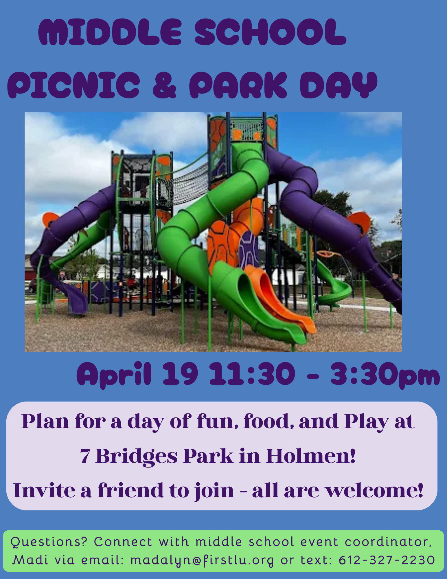 Questions? Connect with middle school event coordinator, Madi via email: madalyn@firstlu.org or text: 612-327-2230.